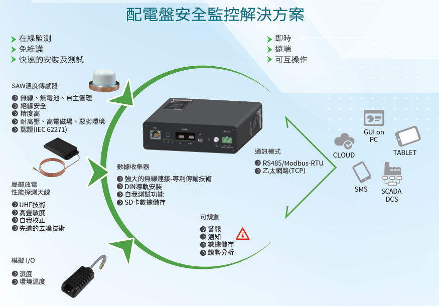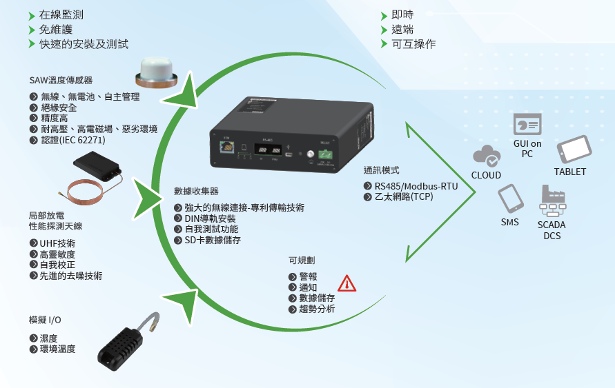 - 熱點溫度、環境溫/濕度、絕緣劣化監測