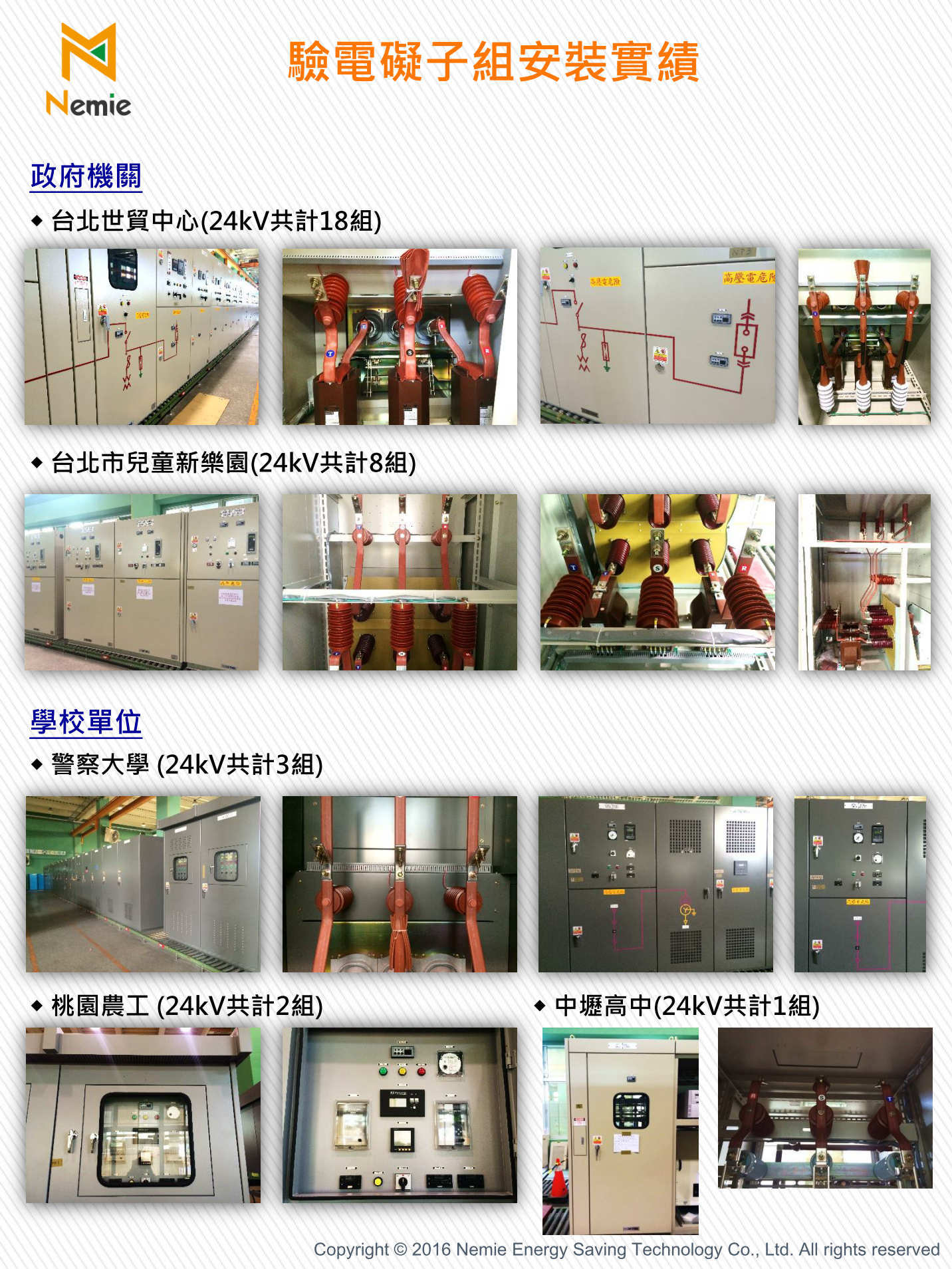 政府機關: 台北世貿中心(24kV 18組)、台北市兒童新樂園(24kV 8組)