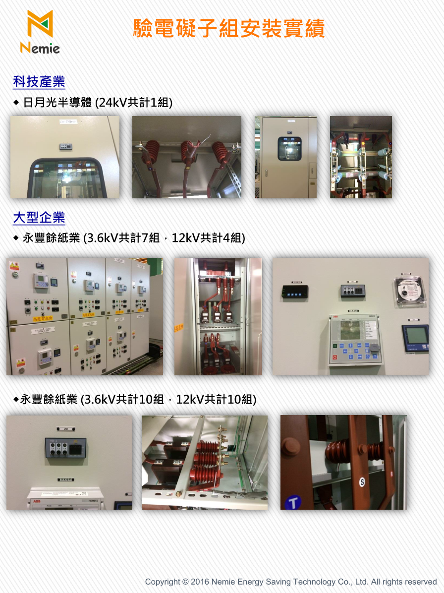 本產品適用於屋內額定電壓3.6 - 36kV、頻率60Hz之高壓電氣設備中,與驗電礙子搭配使用,可以反映高壓回路帶電狀況,以方便機電維護人員巡檢。