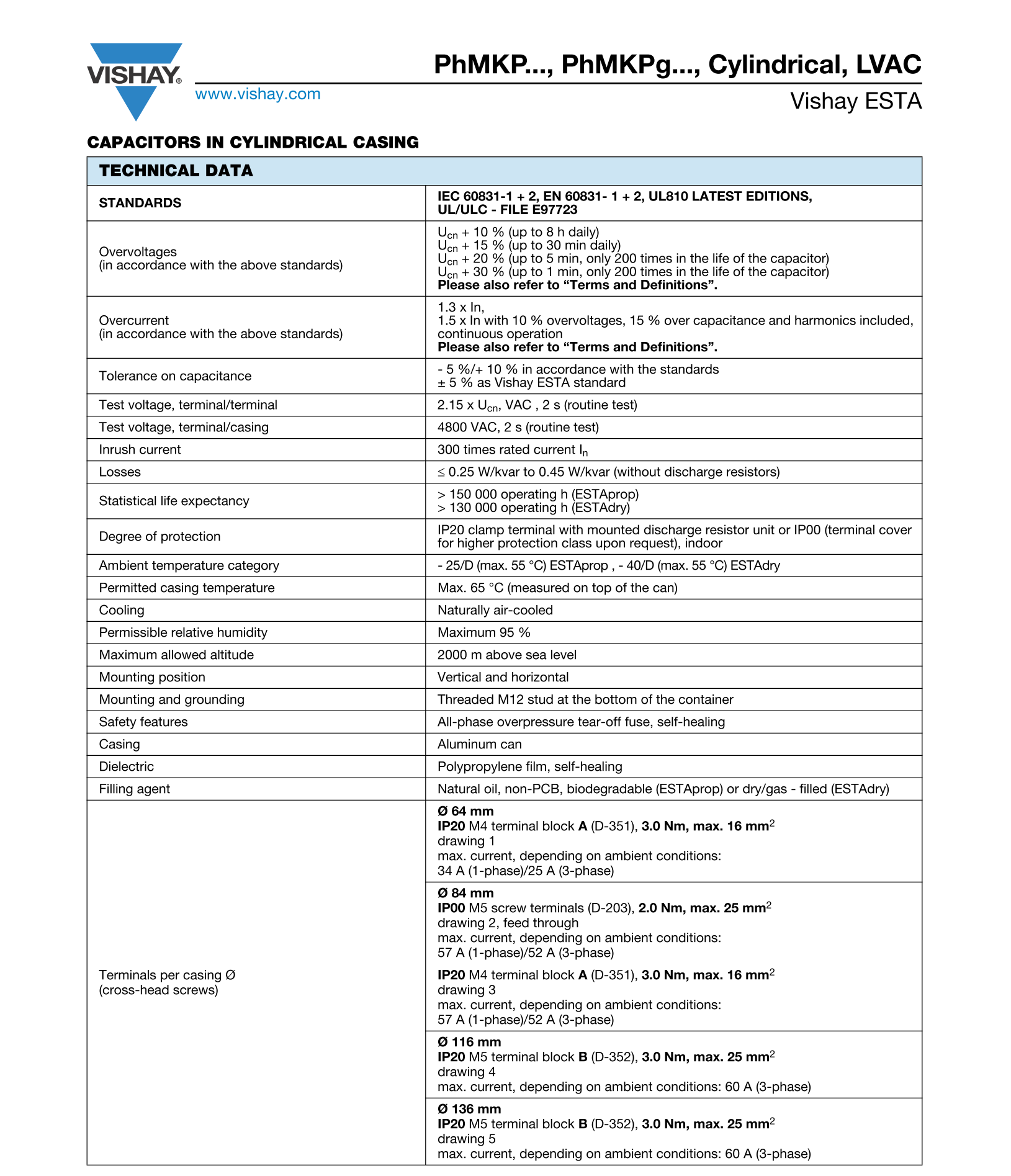 VISHAY ESTA電容器具備之電氣特性、規格及構造如下說明︰